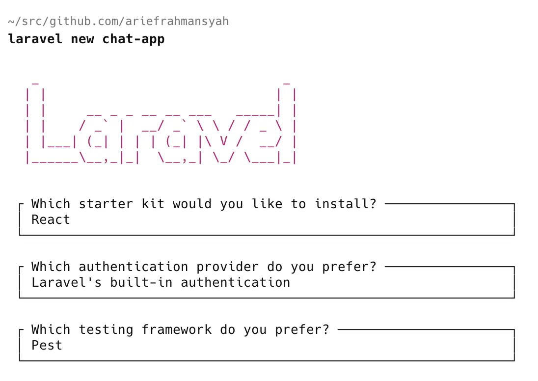 Langkah pertama adalah membuat project Laravel baru dengan React Starter Kit:
