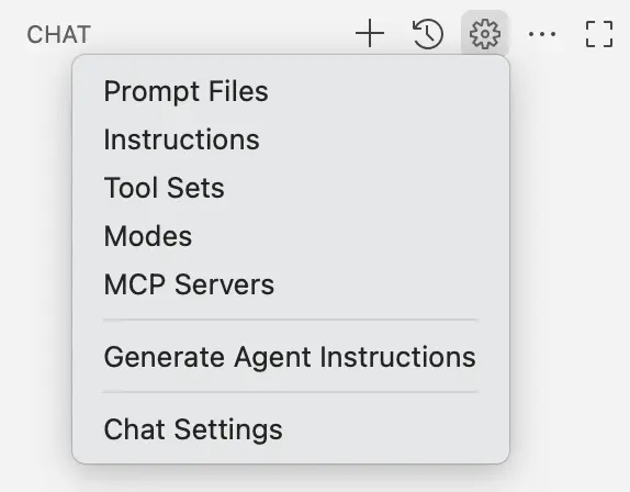 Pertama, pada Chat View di VS Code, klik ikon gerigi dan pilih Instructions: